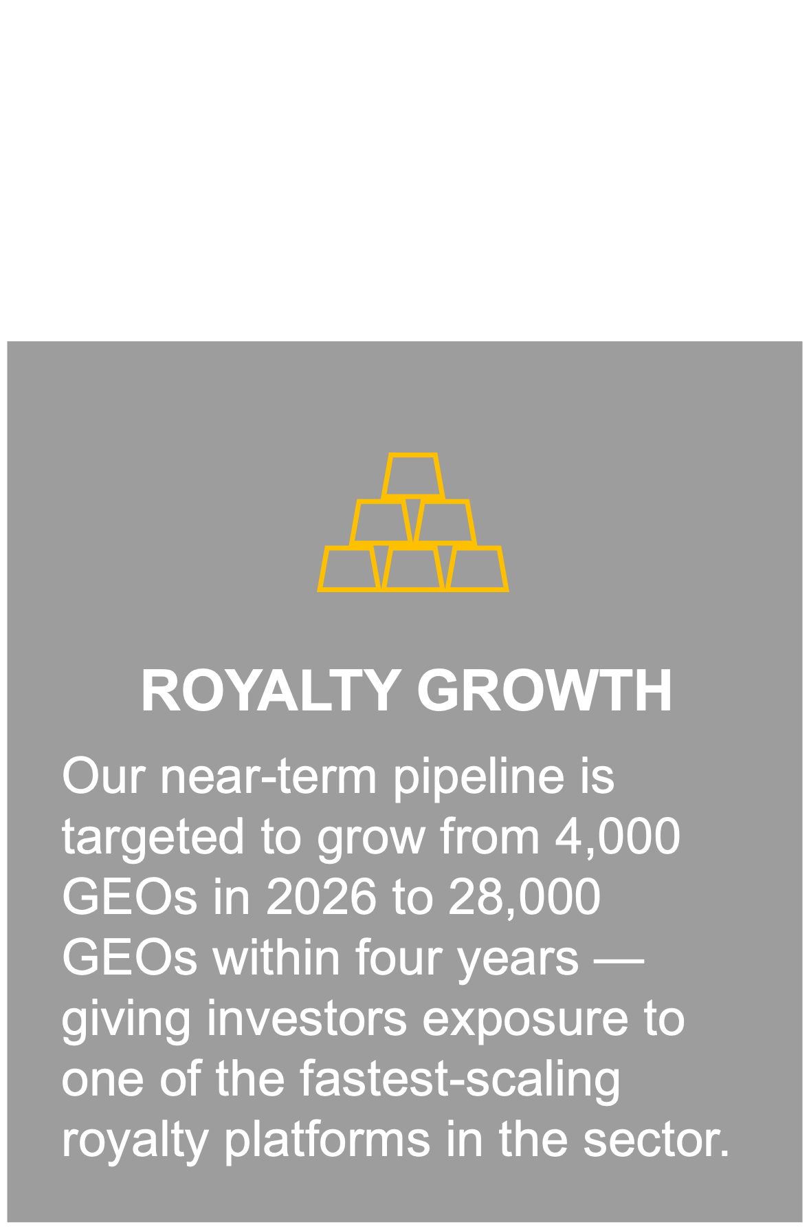 Our royalty portfolio is targeted to grow from ~4,000 GEOs in 2026 to more than 28,000 GEOs within four years - giving investors exposure to a rapidly scaling royalty platform before that production profile is fully priced in.