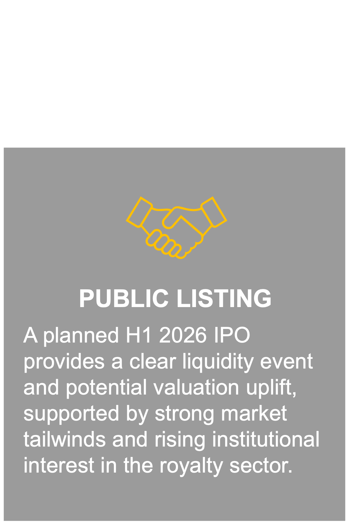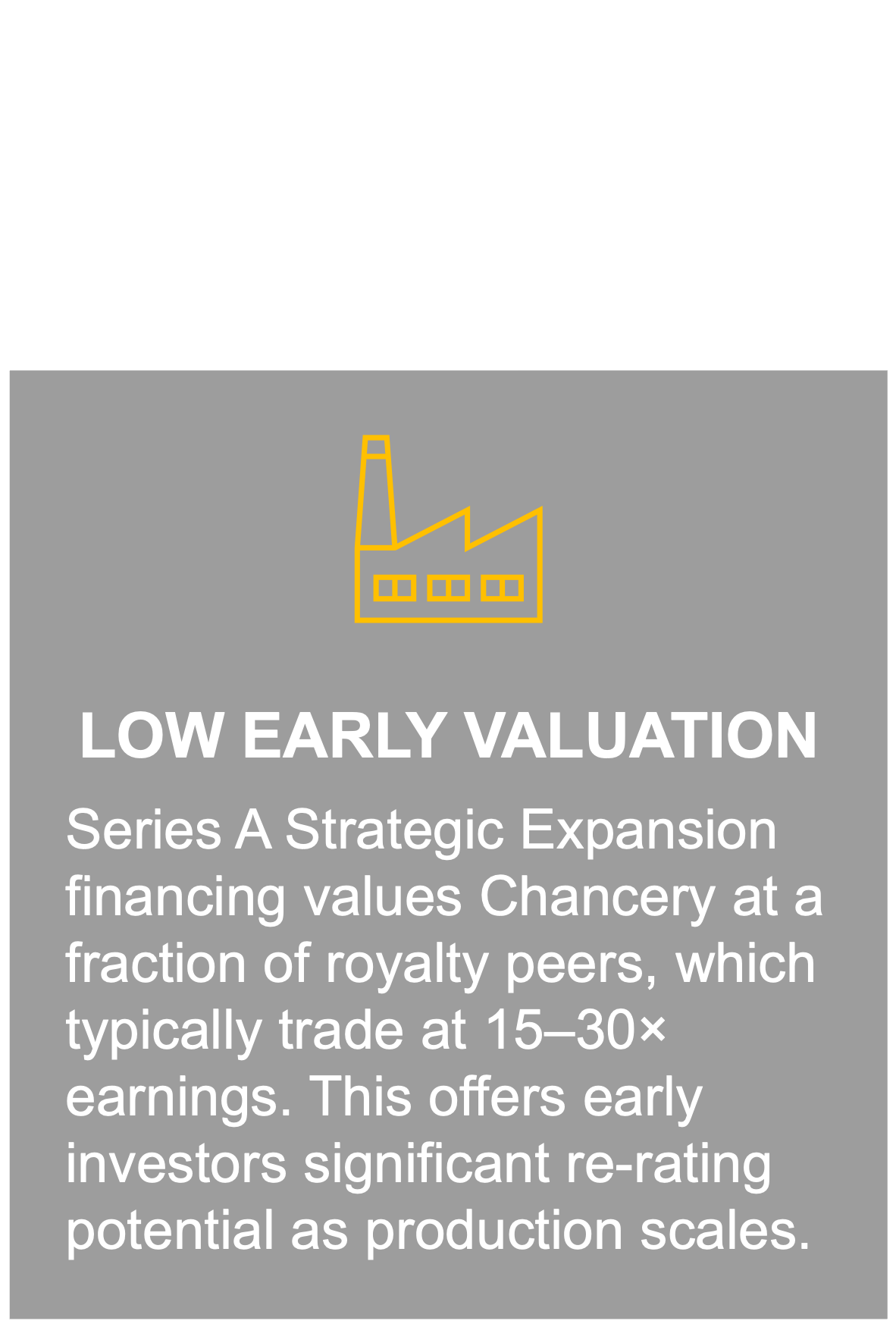 Royalty companies routinely trade at premium valuation multiples (often 15 - 30x earnings or more). Chancery’s pre-IPO valuation currently represents a fraction of peers, creating meaningful upside potential ahead of a significant valuation uplift in the public markets.